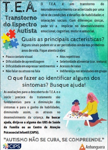 Para dar mais visibilidade ainda sobre este tema, os estagiários de psicologia da Anhanguera sob nossa supervisão realizaram um estudo e trabalho sobre o TEA e o resultado estamos disponibilizando para vocês!